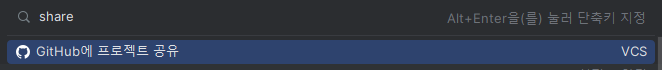 Ctrl + Shift + a (윈도우) / Command + Shift + a (mac)을 누르면 action을 검색할 수 있는데, share project on github를 검색하면 깃허브에 공유하기가 뜸(한글을 설정해놔서 한글로 뜸)